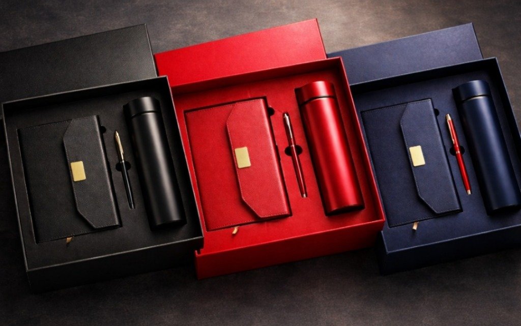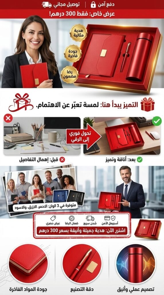 الطقم كيتكوّن من مذكرة أنيقة، قلم عصري،طرموس يحافظ على حرارة مشروبك، كلهم فعلبة فاخرة جاهزة للإهداء.