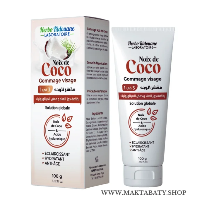 حان الوقت لتكتشفي السر مع مقشرنواة الكوكو (Noix de Coco) للوجه من مختبرات Herbo Ridouane! هذا ليس مجرد مقشر، بل هو حل شامل 3 في 1 يجمع بين الفعالية والنعومة الفائقة.